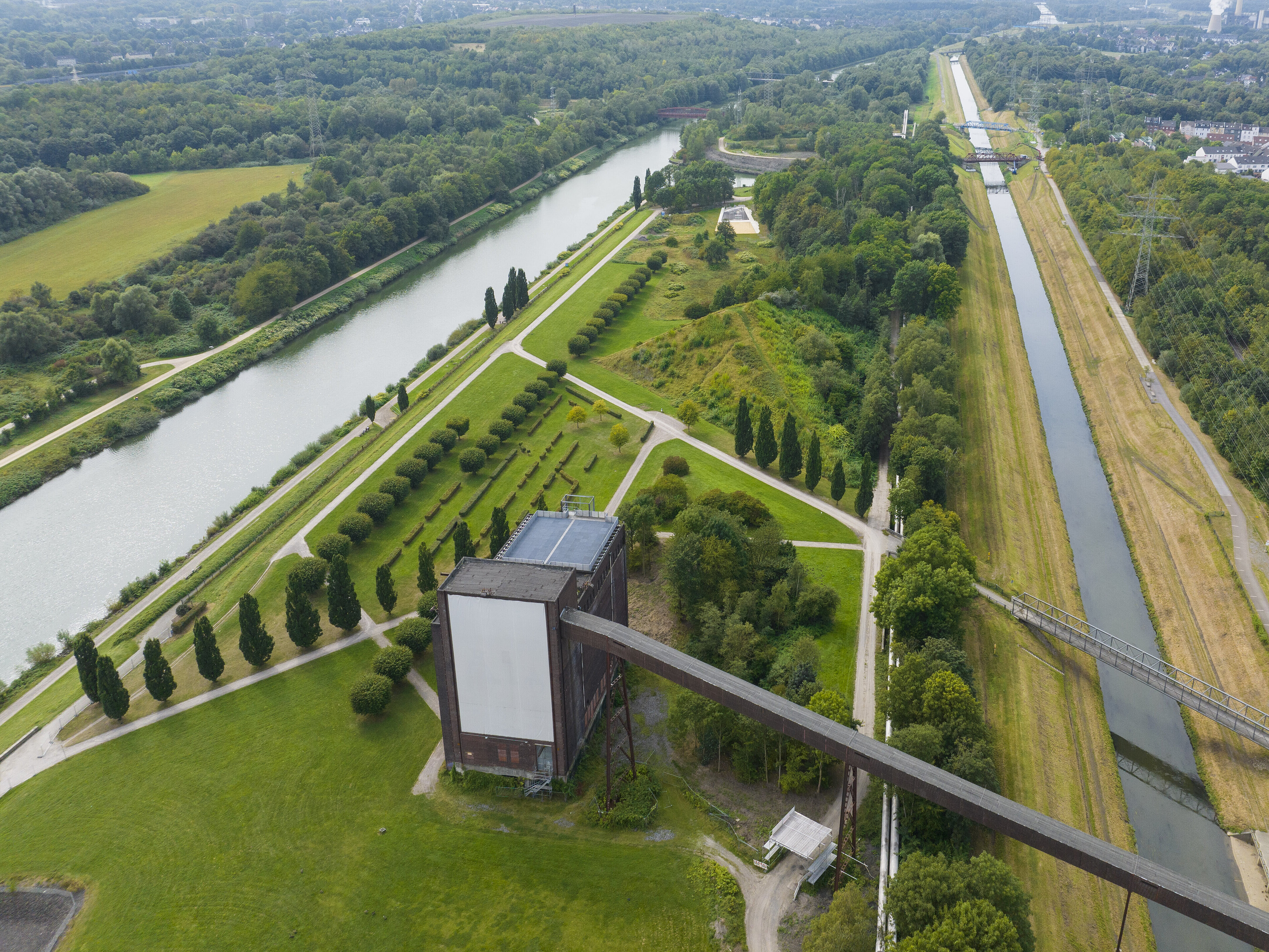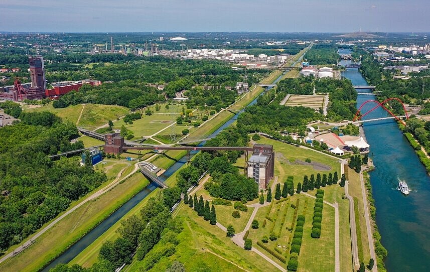 Zwischen Rhein-Herne-Kanal und Emscher entsteht auf rund 28 Hektar ein außergewöhnlicher Zukunftsraum für urbane Transformation, klimaresiliente Stadtentwicklung und grüne Infrastruktur. Wasser, Natur und Industriekultur verbinden sich hier zu einer neuen Parklandschaft, die Antworten auf zentrale Fragen moderner Stadtplanung gibt: Wie gehen wir nachhaltig mit der Ressource Wasser um? Wie werden Städte klimaresilient? Und wie kann Natur mitten im urbanen Raum neue Lebensqualität schaffen?
