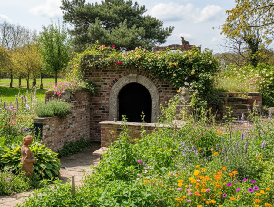Auf, über und unter der Erde gibt es viel zu entdecken: Im Zentrum des Gartens liegt der Nachbau eines historischen Erdkellers, der optimale Bedingungen für die natürliche Lagerung von Lebensmitteln bietet. Eine großzügige Anpflanzung unterschiedlicher Gehölze, darunter Obstbäume, Klimabäume, Exoten und echte Raritäten geben der Anlage Struktur und Charakter. Leuchtende Blumenarrangements und Dekoelemente aus Metall und Naturstein runden das Bild ab. Der Weg führt durch den angrenzenden, großzügigen Nutzgarten, von wo aus Obst, Gemüse und Kartoffeln ihren Weg in die traditionelle Lagerung im Erdkeller finden.