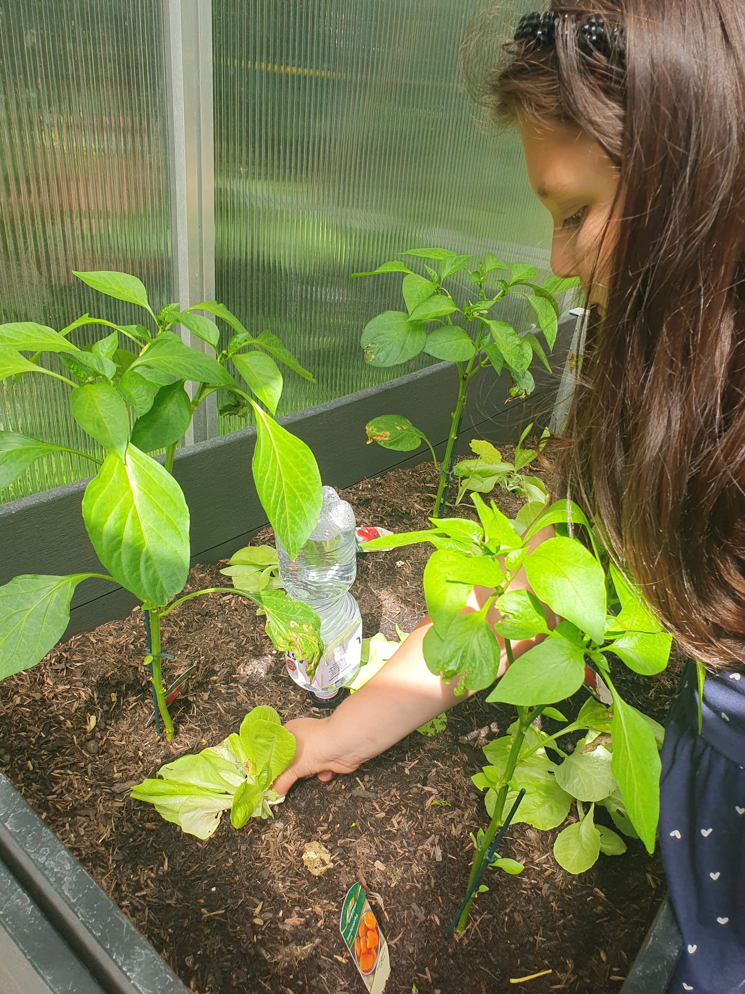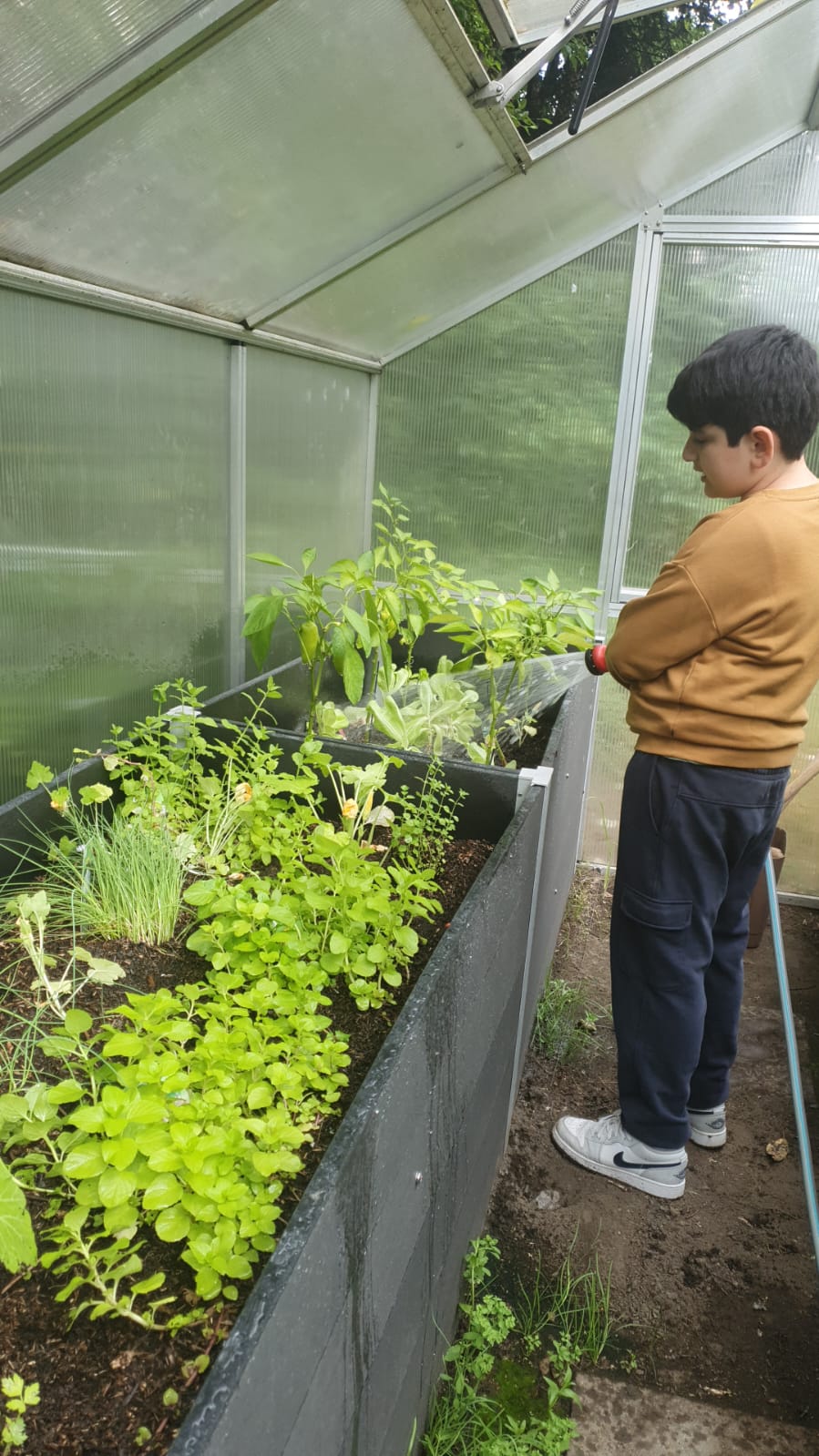 Es wurden Beete und Komposter angelegt, sowie Obstgewächse, Gemüse, Salat und Kräuter gepflanzt. Ein großes Gewächshaus mit Hochbeeten ergänzt die Gartenfläche.
