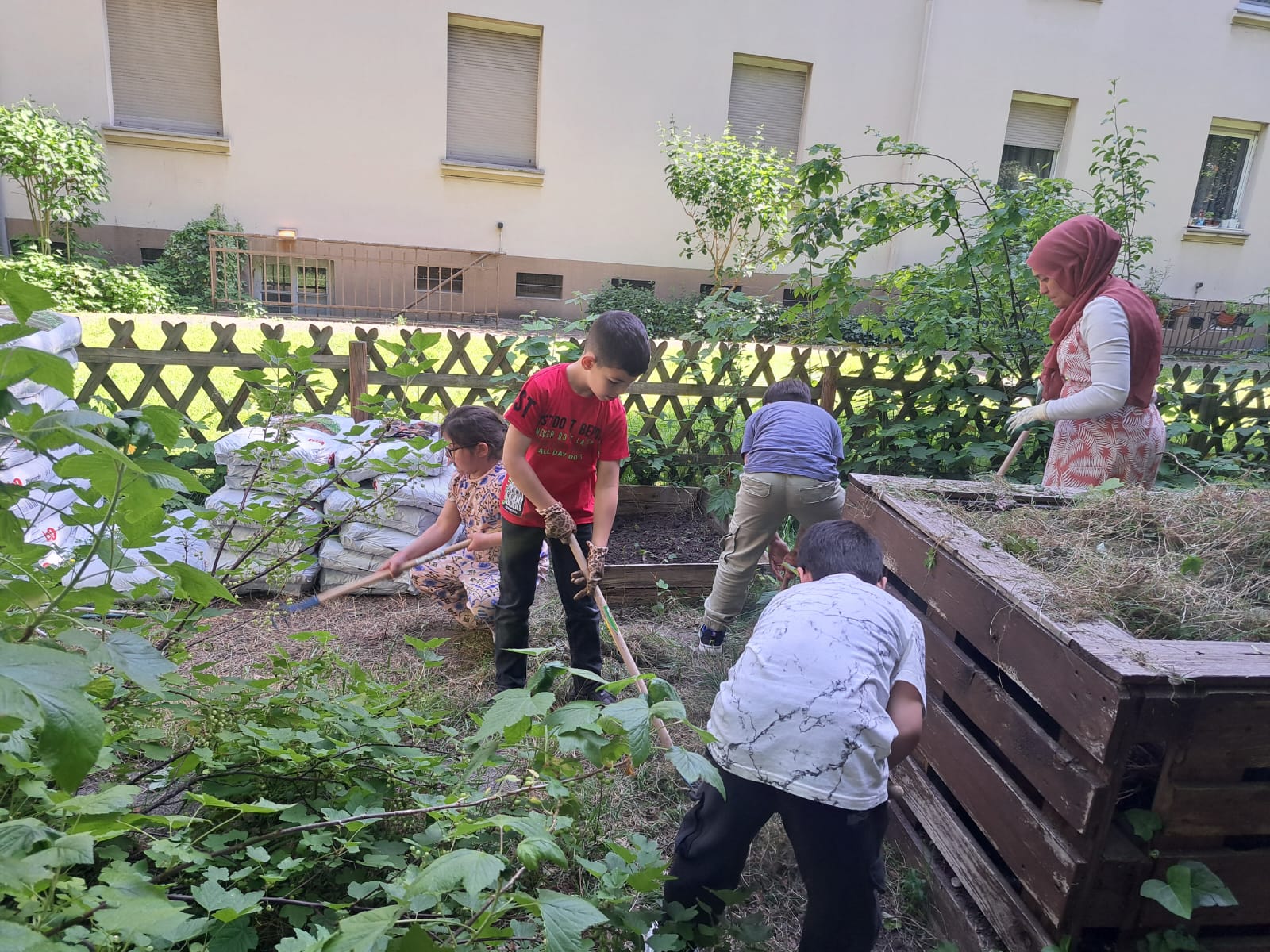 Unser Bio-Schrebergarten befindet sich im parkähnlichen Innenhof (5000 qm) einer Wohnanlage mitten im Stadtviertel Duisburg-Hochfeld. Die Besucherkinder vom Kindertreffpunkt Bienenreich waren bereits von der Planung des Projektes an beteiligt. Die Kinder bepflanzen und bewirtschaften den Schrebergarten gemeinsam und werden dabei unterstützt von den Kursleiterinnen.
