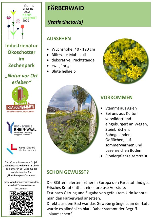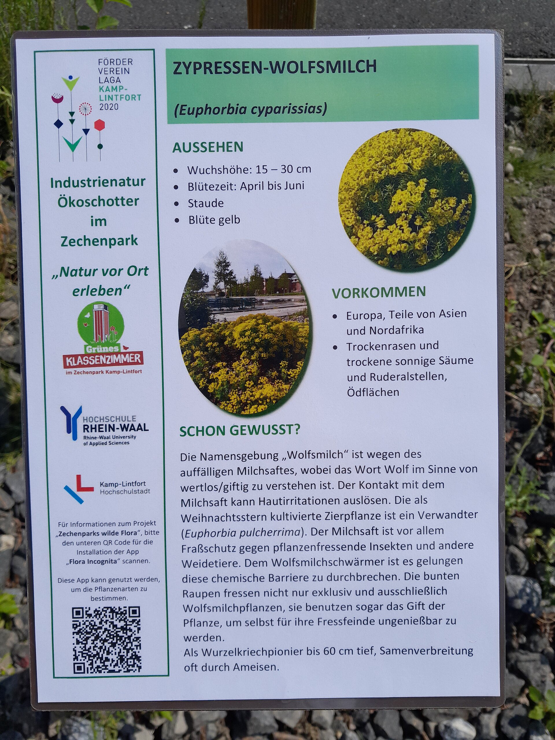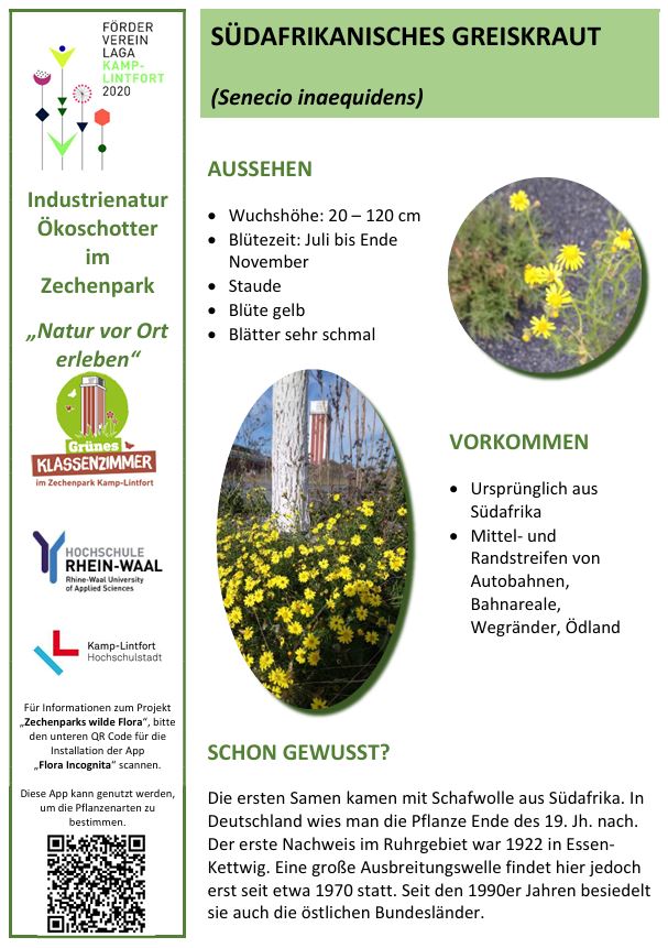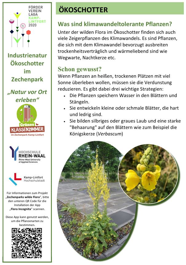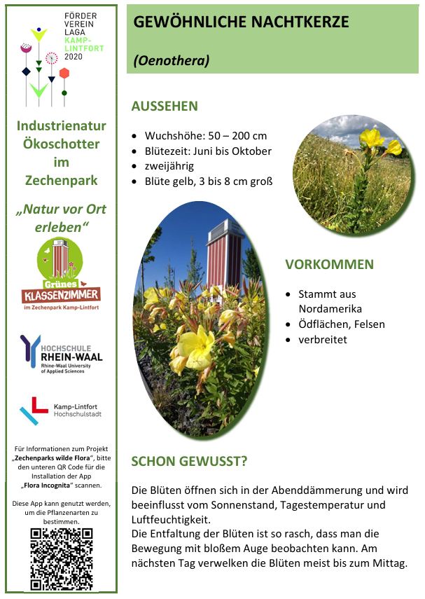 Der Zechenpark Kamp-Lintfort ist nach der „LaGa“ 2020 ein Lernort für biologische Vielfalt.Der Zechenpark in Kamp-Lintfort bietet seit der Landesgartenschau 2020 verschiedene Möglichkeiten, die biologische Vielfalt zu erkunden. Im Park gibt es einen Naturpfad, der auf Infotafeln Wissenswertes über die besondere Vegetation im Park, z.B. des Ökoschotters oder der artenreichen Wiesen bereithält.QR-codes auf den Infotafeln informieren über das bürgerwissenschaftliche Mitmach-Projekt „Zechenparks wilde Flora“, das Parkbesuchern ermöglicht, mit einer App die Pflanzen im Park zu bestimmen und über eine Zusatzfunktion der App nach Eingabe eines Codes die gesammelten Daten mit dem Projekt zu teilen. Eine Anleitung hierfür findet sich auf der Webseite des LaGa Fördervereins.