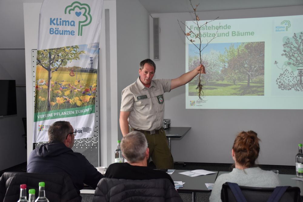 Freilich nicht allein durch die Internatsspielerinnen. Rund 20 Vertreterinnen und Vertreter von Kleingartenvereinen, Stiftungen und Schulen hatten sich im Vorfeld zur "Train-the-Trainer“-Veranstaltung des RVR und der IGA 2027 im SportCentrum Kaiserau angemeldet, um zunächst im Theorieteil alles über das Thema Pflanzen zu erfahren. Mit der Aktion Klimabäume setzt der Regionalverband Ruhr seine Initiative für mehr Biodiversität und grüne Infrastruktur fort – in enger Partnerschaft mit der IGA 2027, die am 23. April 2027 eröffnet wird.
