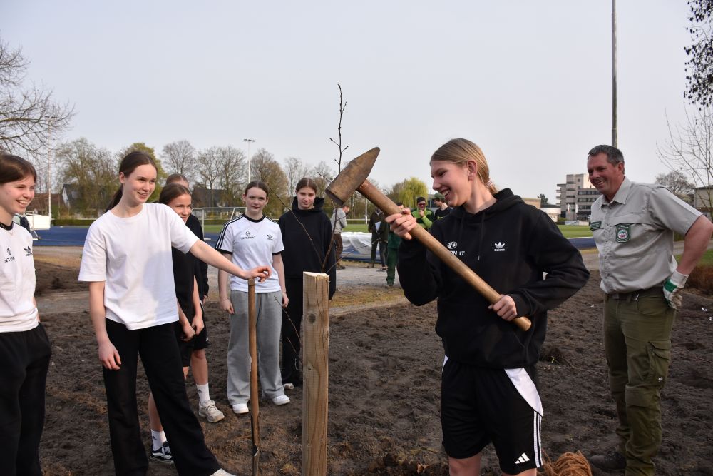 Greta Hohensee schnappt sich die Gartenschere und kappt noch ein paar Zweige. Lina Winter hält derweil den Stützpfahl, den Lara Brandes mit einem großen Vorschlaghammer im Kaiserauer Boden versenkt. Mathilda Bornhoff bereitet das Juteseil vor und befestigt dieses dann zwischen Pfahl und Stamm – der erste Baum auf der rund 100 m² großen, ehemaligen Wiese ist eingepflanzt und stabilisiert. Nur der Name fehlt noch. „Das ist Elisabeth“, tauft Yumnah Lohnherr den Internatsbaum, ehe bis zum Ende des Nachmittages noch rund 30 weitere Gehölze und Sträucher eingesetzt werden.