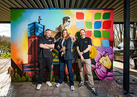An der Kreuzung von Erzbahntrasse und Zollverein-Radweg auf der Stadtgrenze Gelsenkirchen, Bochum und Herne ist ein moderner Rastplatz mit überdachten und beleuchteten Sitzbereichen, Fahrrad-Abstellflächen und einer barrierefreien Toilettenanlage entstanden. Der Regionalverband Ruhr hat den neuen Rastplatz auf der Erzbahntrasse in Betrieb genommen. Die Außenwände hat der Gelsenkirchener Graffiti-Künstler Beni Veltum mit farbenfrohen Motiven aus der Region und der Internationalen Gartenschau IGA 2027 im Ruhrgebiet verziert.