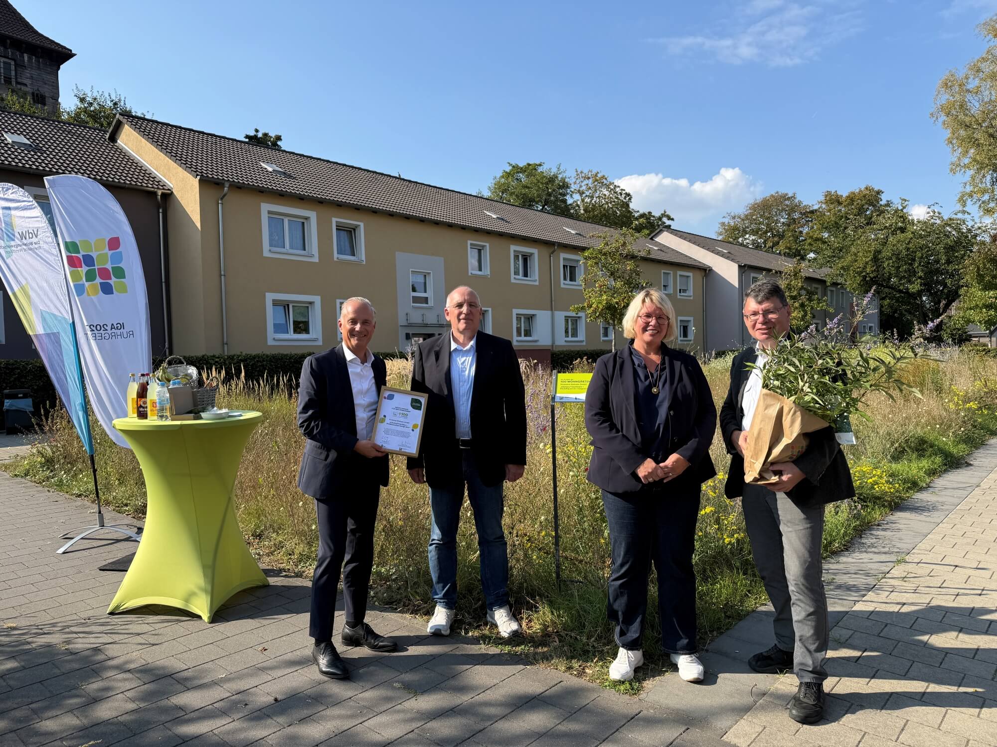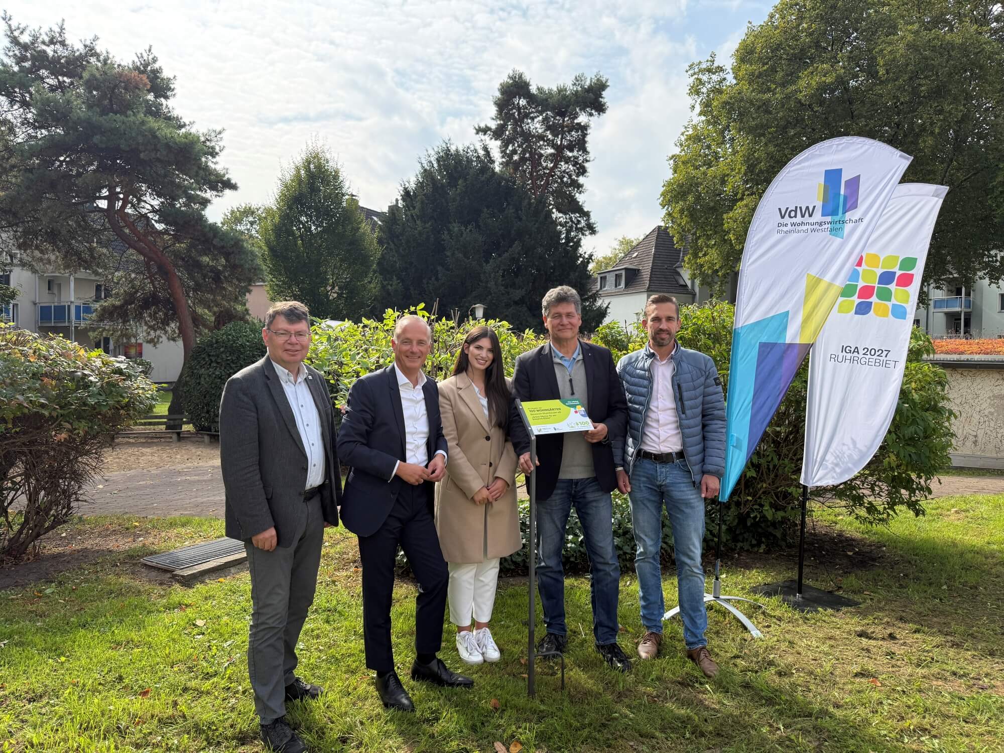 Mit der Verleihung würdigen der VdW Rheinland Westfalen und die IGA 2027 das Engagement der sozial orientierten Wohnungswirtschaft für grüne, klimaangepasste und soziale Quartiersgestaltung. Die erste Bereisung führte nach Essen und Duisburg, wo drei Mitgliedsunternehmen und -genossenschaften des VdW Rheinland Westfalen ihre umgesetzten Projekte präsentierten.